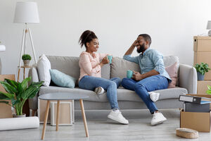 Black couple resting on couch in living room with cardboard boxes after moving in their new home