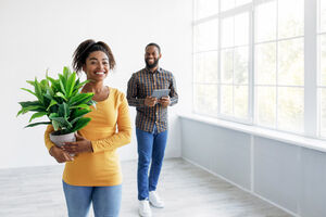 Black couple holding tablet and potted plant smiling while walking near window in their new home