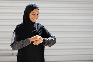 Black woman using smartphone while standing at table with laptop and vegetables in kitchen at home