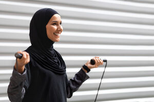 Cheerful Black female tutor wearing eyeglasses and headset gesturing hands while sitting at table with cup of coffee during online lesson in kitchen at home