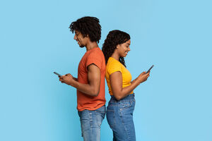 Black woman using smartphone sitting with crossed legs on bed near laptop in bedroom at home