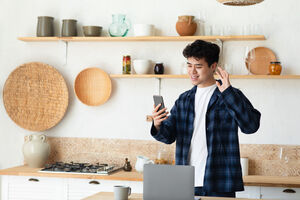 Middle Eastern man using smartphone and holding credit card while sitting at table at home