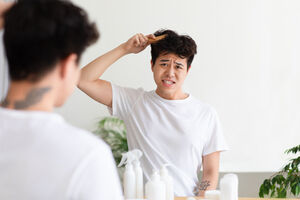 Middle Eastern man with closed eyes wearing eyeglasses covering ears with hands while sitting at home
