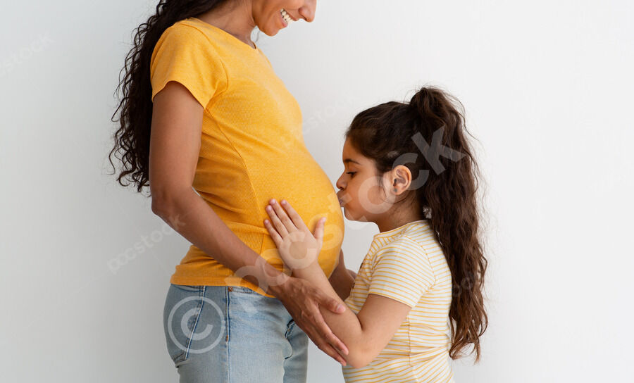 Asian woman standing with closed eyes and hands on chest against blue background in studio