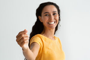Asian woman looking and pointing fingers up while standing against blue background in studio