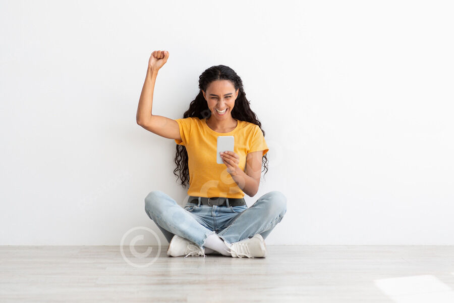 Asian woman showing smartphone screen and showing thumbs up while standing against blue background in studio
