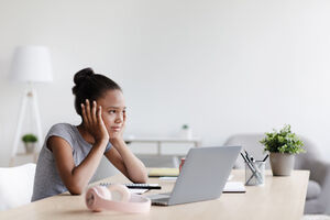 Shocked Asian woman wearing eyeglasses touching head looking away while sitting at table with laptop and books against blue background in studio