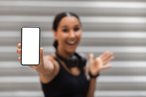 Asian woman pointing finger and showing smartphone screen while standing against blue background in studio