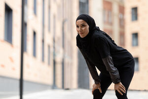 Asian woman touching face while jumping against blue background in studio