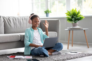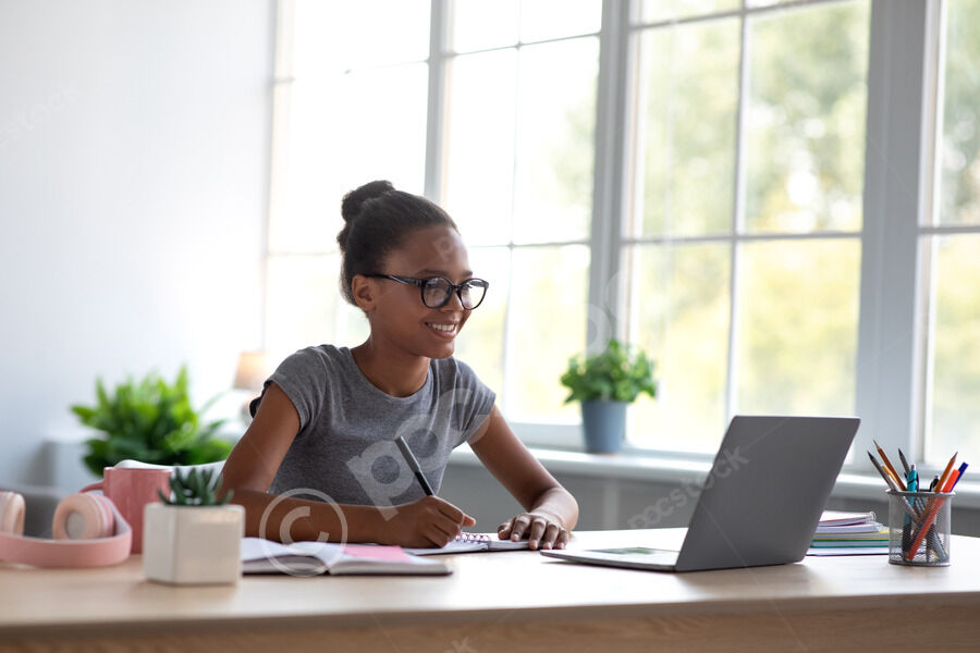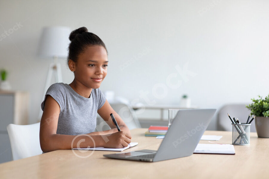 Black couple holding and pointing fingers at laptop while standing against pink background in studio