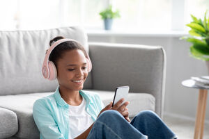 Black couple holding smartphones looking at each other while standing against pink background in studio