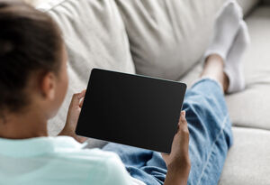 Black couple holding and showing smartphone screen while standing against pink background in studio