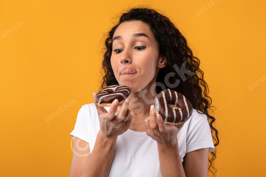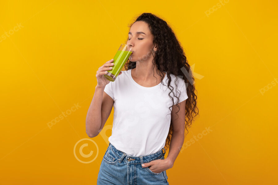 Smiling Black woman wearing Sant hat and sweater dancing against blue background in studio