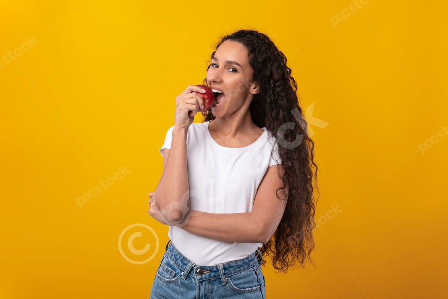 Smiling Black woman wearing Santa hat holding gift box jumping against red background in studio
