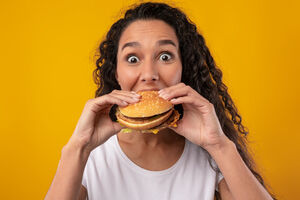 Smiling Black woman wearing Santa hat jumping with open arms against red background in studio
