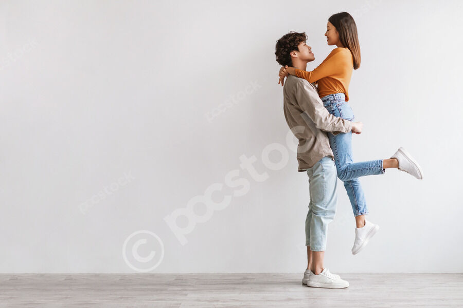 Black couple pointing finger and looking up while sitting on floor against white wall