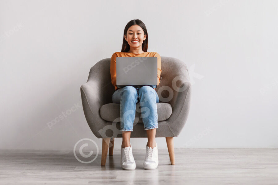 Black couple using laptop while sitting near shopping bags on floor against white wall