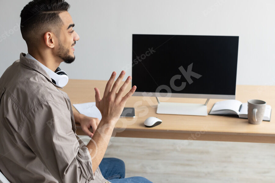 Smiling Middle Eastern woman in sportswear waving hand showing smartphone with blank screen standing in front of roller shutter on street during daytime