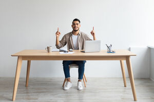 Middle Eastern woman with headphones on neck wearing sportswear leaning on huge smartphone with blank screen standing on street during daytime