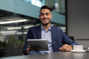 Black woman holding tablet and credit card while sitting with crossed legs on floor near shopping bags in clothing store