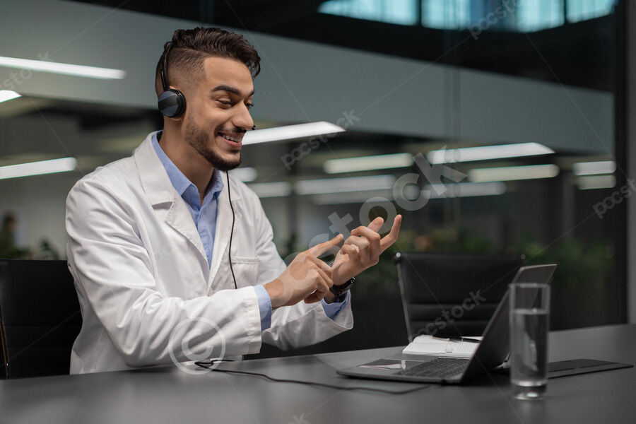 Black woman wearing silk pajamas and headphones waving hand having video call using laptop while sitting on bed in bedroom at home