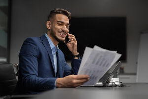 Black woman wearing silk pajamas having phone call while sitting on bed with laptop in bedroom at home