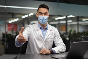 Black woman showing thumbs up sitting with laptop on lap on closet against clothes at home