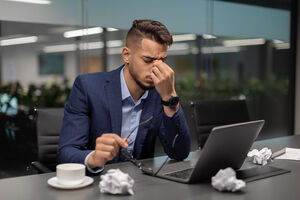 Black woman touching cheek suffering from pain while sitting with closed eyes on bed in bedroom at home