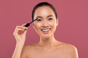 Black girl with closed eyes taking off facemask standing against yellow background in studio