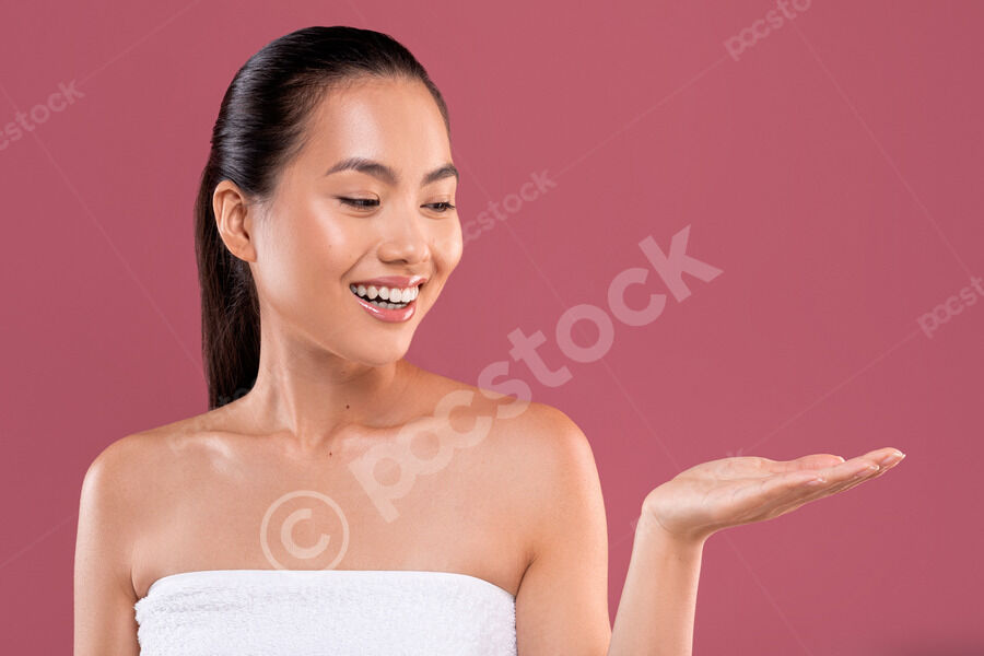 Smiling Asian man squeezing cream on his hand while standing in bathroom at home