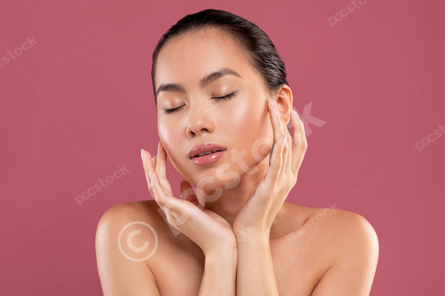 Asian man checking his face in front of mirror while standing in bathroom at home