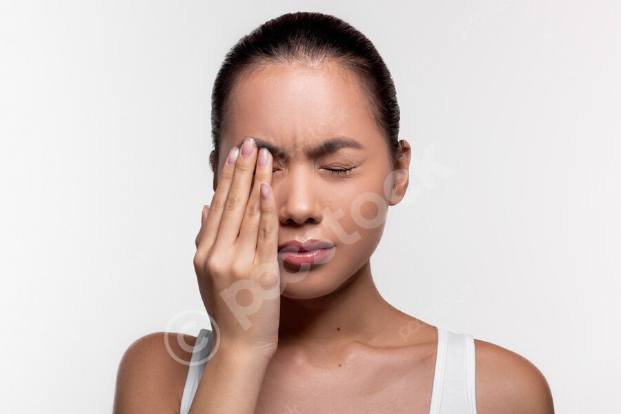 Asian girl with closed eyes covering ears with fingers while standing near mother scolding her in living room at home