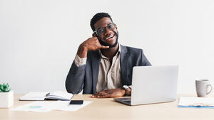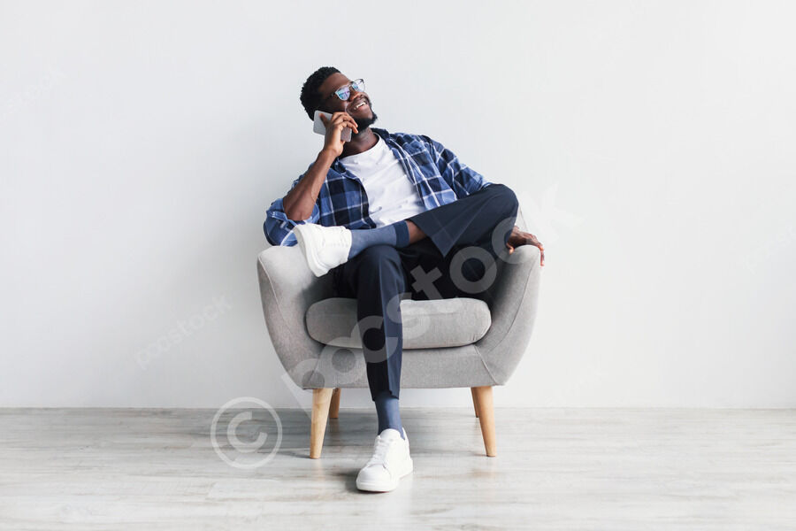 Cheerful Black man wearing eyeglasses having phone call holding shopping bags and looking away while walking on city street during daytime