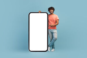Bearded Indian man with curly hair showing thumbs up gesture while standing near huge smartphone with blank screen in front of blue background in studio