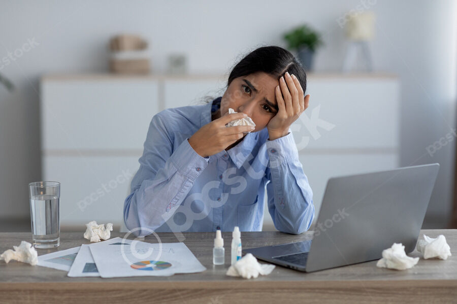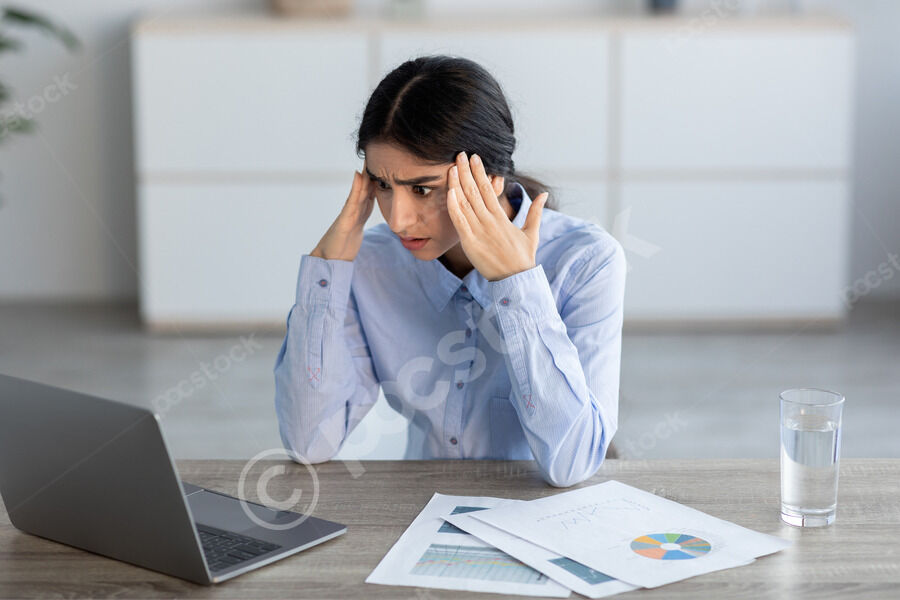 Angry Arab man in headphones holding and looking at tablet screen disappointed while standing against pink and purple gradient background in studio