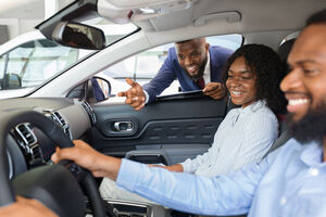 Arab man with beard looking and pointing at huge smartphone with empty white screen while sitting on chair against pink and purple gradient background in studio