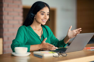 Black woman with braids wearing earphones waving hand having video call using laptop while sitting on chair at home