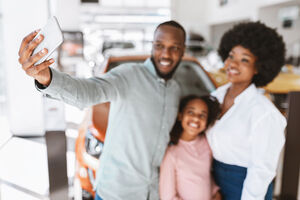 Black woman with braids showing peace hand sign taking selfie using smartphone while sitting with crossed legs on floor at home