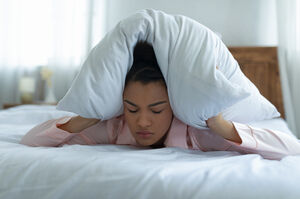 Asian woman crying while covering face with hands sitting on chair against white wall in studio