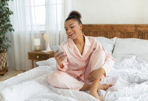 Asian woman using smartphone sitting with crossed legs on chair against white wall in studio