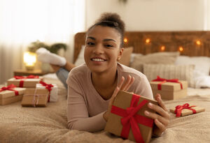 Shocked Black female teenager looking inside shopping bags while standing against pink background in studio