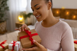 Black female teenager with hand near face whispering while standing against pink background in studio