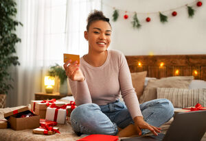 Black female teenager holding credit card and pointing finger away while standing against pink background in studio