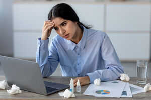 Asian couple using laptop and tablet while sitting apart on sofa in front of white wall at home