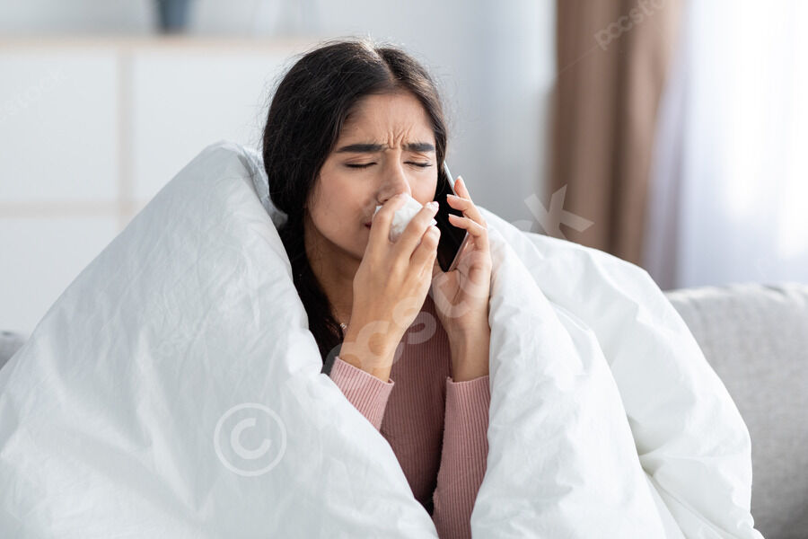 Asian couple fanning with hands using remote turning on air conditioner while sitting together on sofa in front of white wall at home