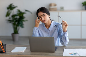 Asian couple leaning chins on hands ignoring each other while sitting apart on sofa in front of white wall at home