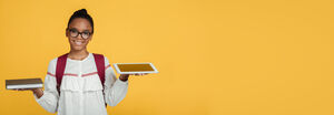Cheerful Asian couple raising closed fists celebrating success using tablet together while sitting on sofa in front of white wall at home