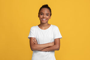 Asian couple with crossed arms ignoring each other while sitting apart on sofa in front of white wall at home
