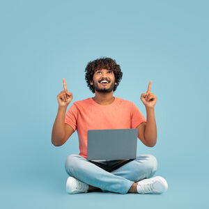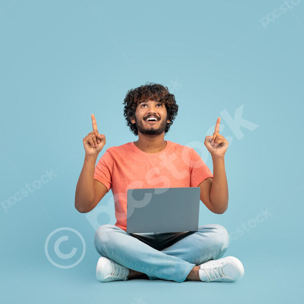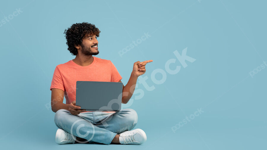 Bearded Indian male freelancer with curly hair pointing fingers up working on laptop while sitting on floor in front of blue background in studio