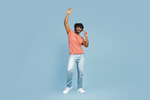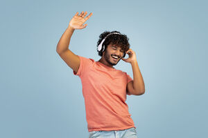 Smiling bearded Indian man with curly hair listening to music on headphones while dancing with raised arm in front of blue background in studio